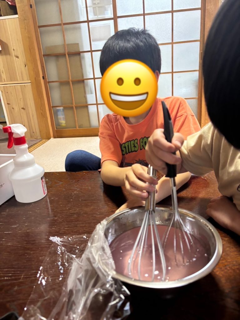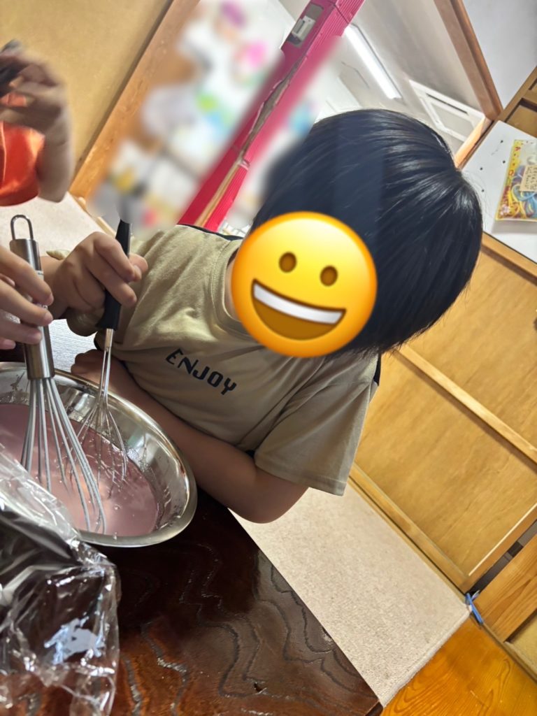 紫陽花ゼリーを作っているときに、1人の子が「そういえば、今年は紫陽花の花が咲くのが遅い気がする。」と伝えてくれました。季節を感じる心が素敵だと思いました。